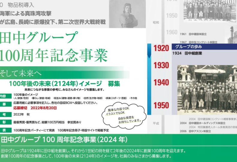 田中グループでは、2024年4月1日の創業100周年に向けて、様々な記念事業を行っております。2022年は第2回目の記念事業としてグループ社員の皆様に100年後のイメージを募集しております。100年後の未来をグループ社員皆様と一緒に考えることにより、世界中の人々の幸せ、地域の発展、街の健康を守る、そして持続可能な企業であり続けるため、このコンテストを開催させていただいております。